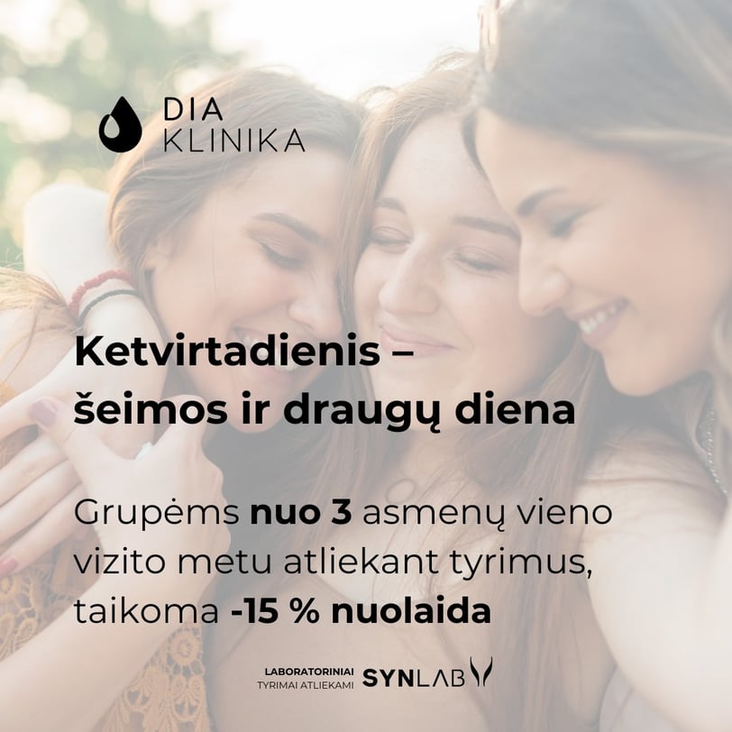Grupėms nuo 3 ir daugiau asmenų, vieno vizito metu atliekant tyrimus, taikoma -15% nuolaida!